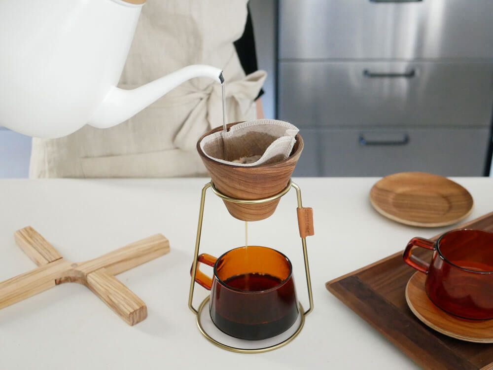 コーヒーの美味しさを最大限に引き出し、そのひとときを静かに盛り上げるコーヒードリッパー。今回ご紹介するのはそのドリッパーとスタンド各2種、リネンフィルターの絵になるセットです。