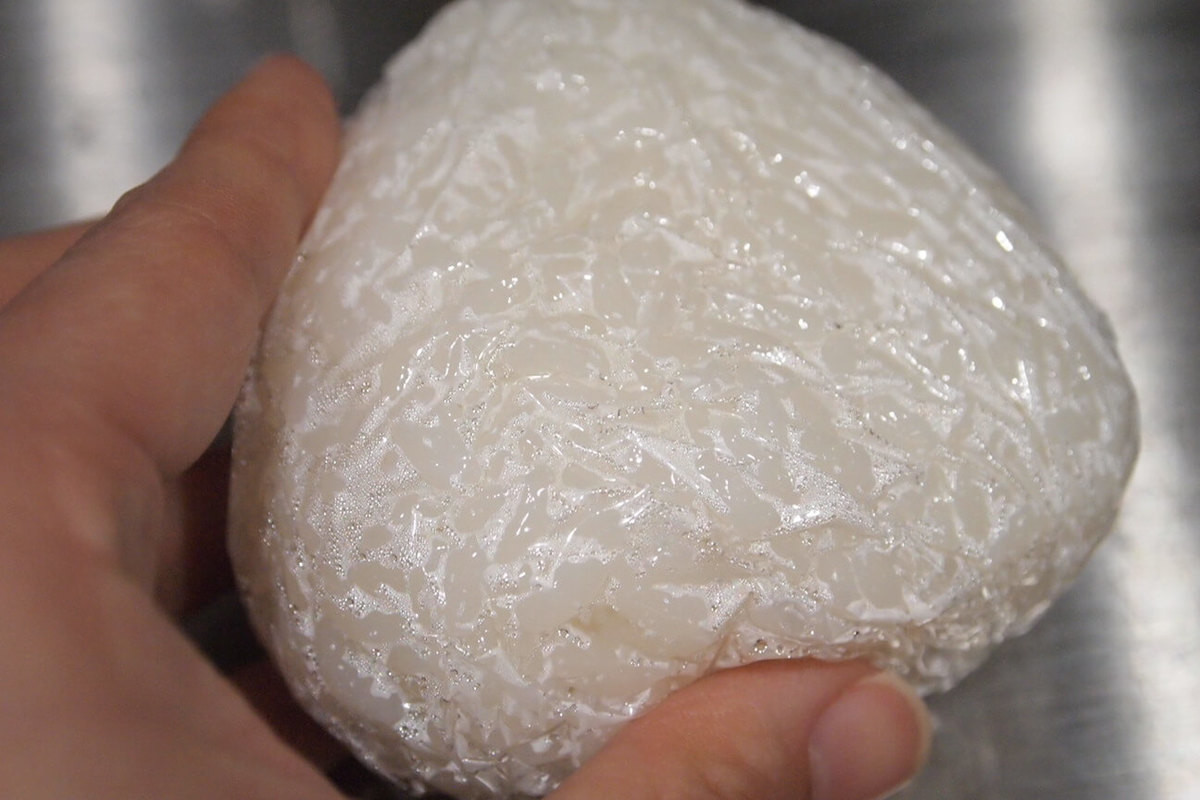 実際におにぎりにして食べてみないと、これだけで本当にごはんがベチャッとしないか半信半疑ですよね。そこで、さっそく少し冷ましたご飯を使っておにぎりも作っていきたいと思います。