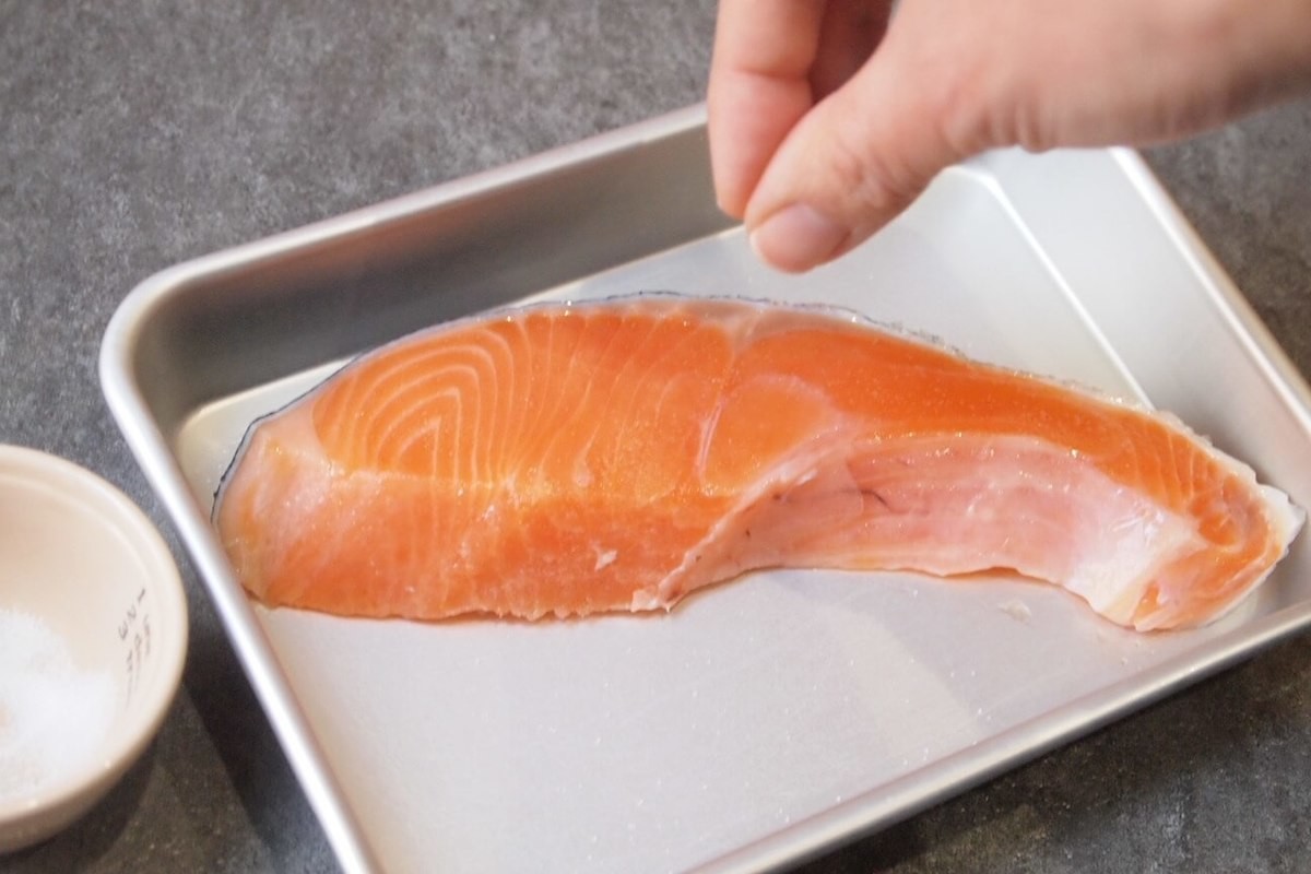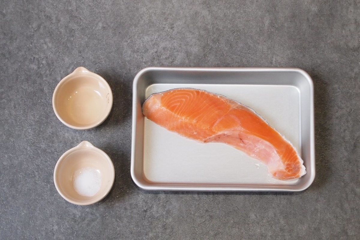 まずは、鮭の両面にまんべんなく塩を振りかけます。