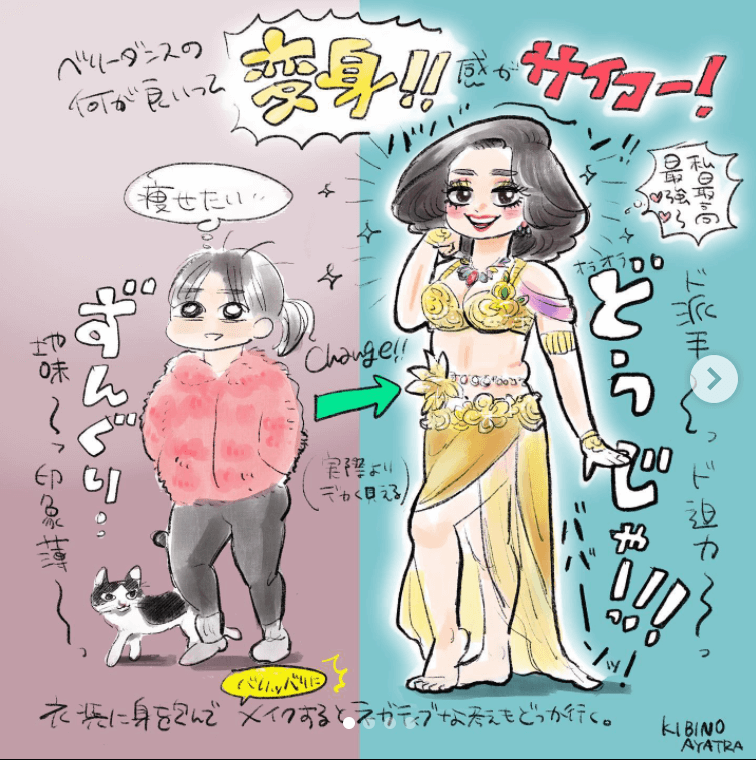 この漫画を描いた、きびのあやとらさんはベリーダンスが趣味。踊っている最中は、「口角がキリッ」と上がった表情でいるのが鉄則なのだそうです。