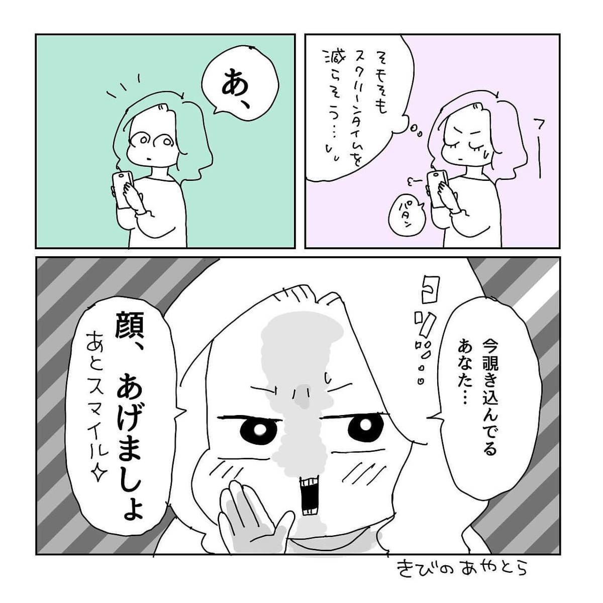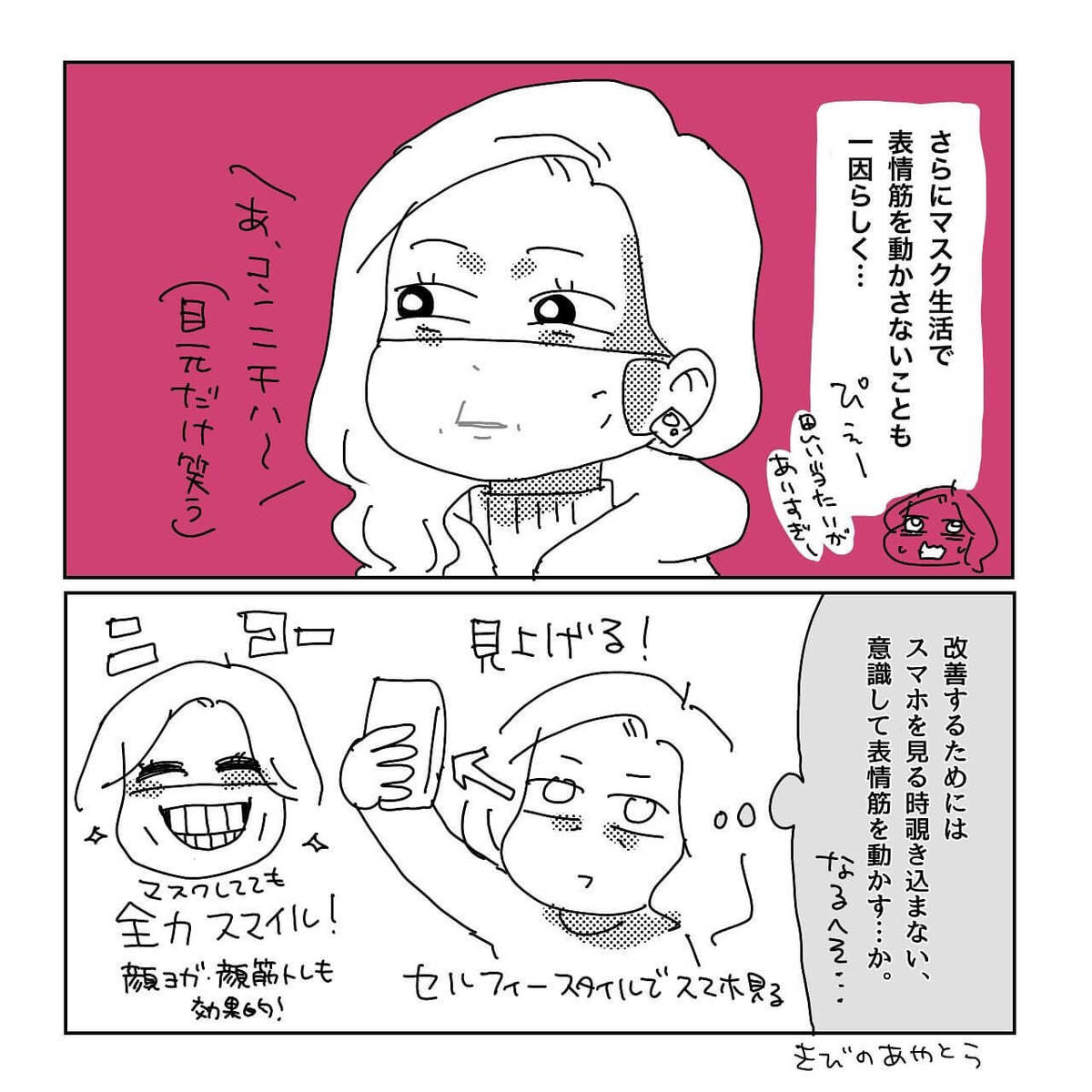 はい、私もドキッとして共感した1人です。今日からスマホは顔の位置に上げることにします。マスクの下でも笑うようにします!