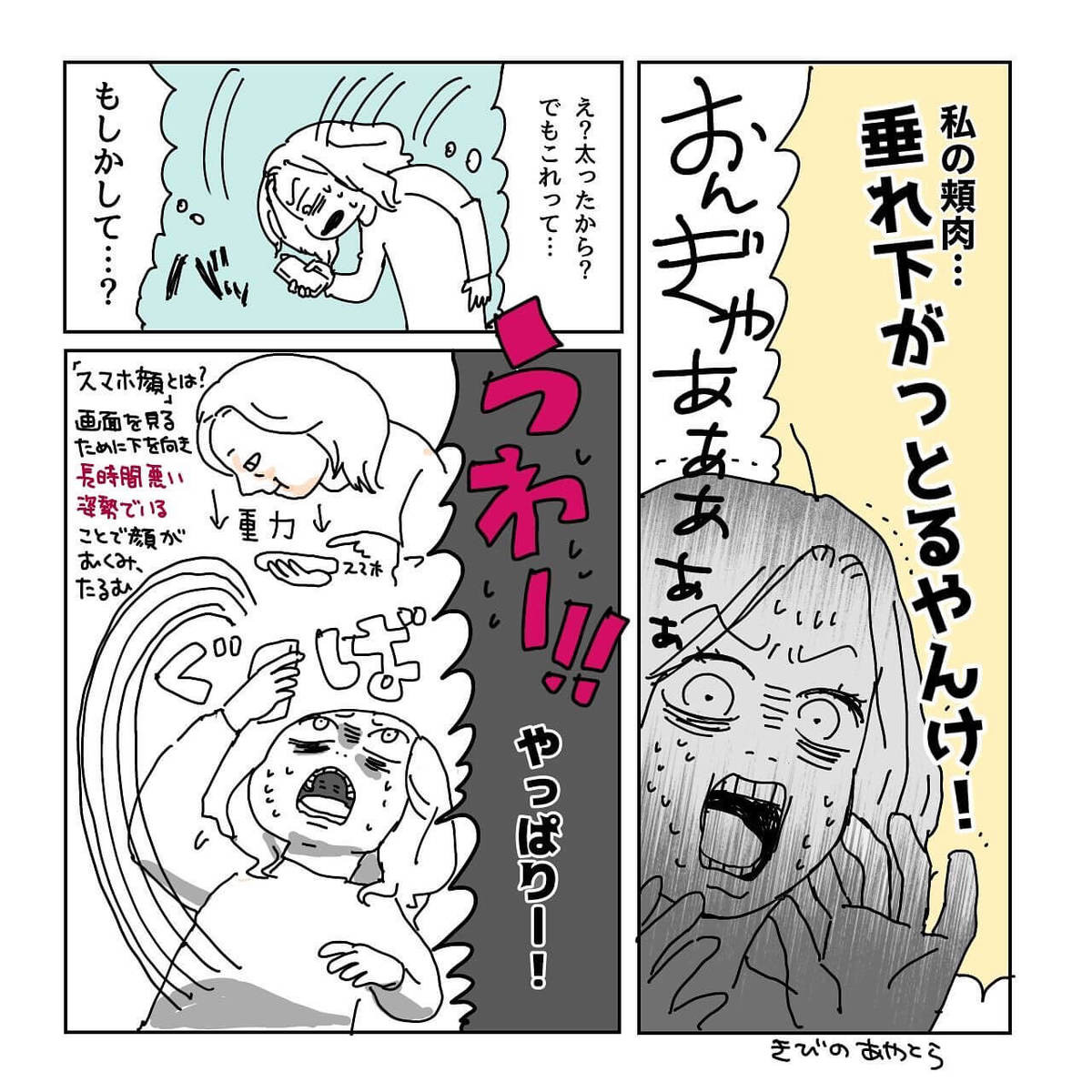 【漫画】おんぎゃぁぁ!顔に恐ろしい"たるみ"がぁぁ(絶叫)!今やってる「スマホ&マスク習慣」に喝