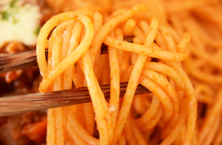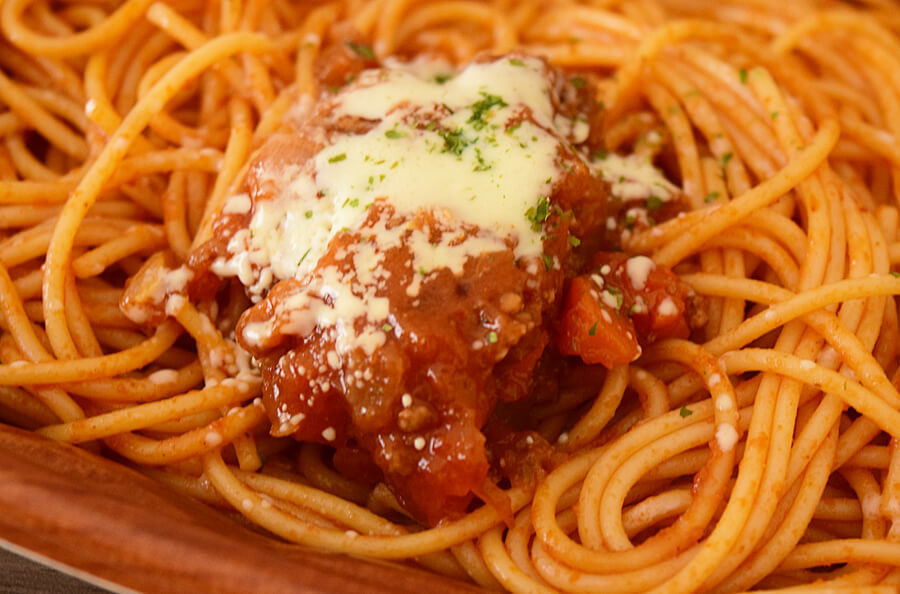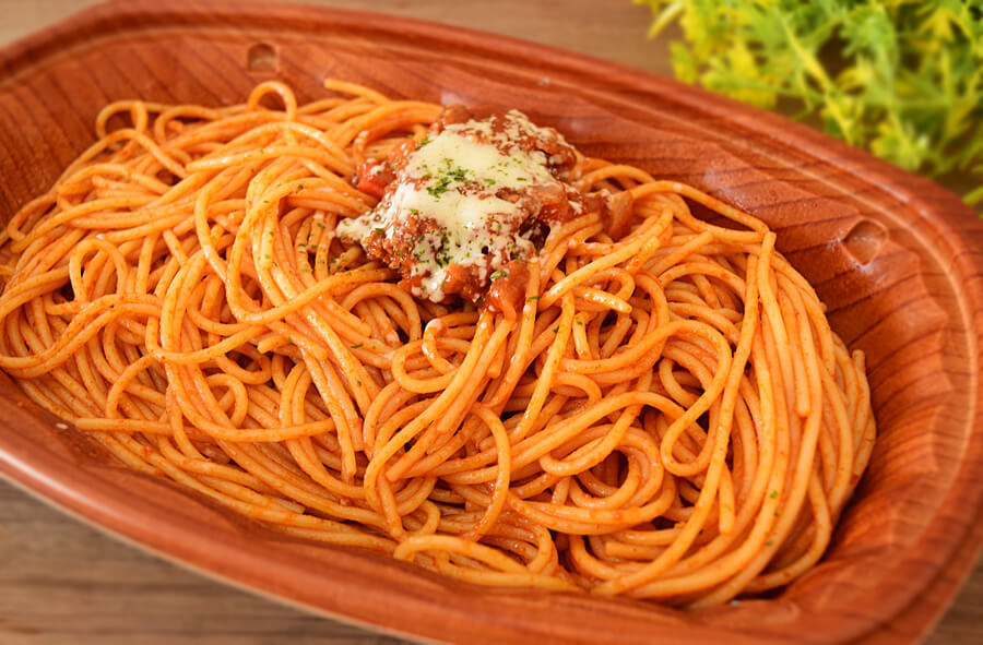 ミートソースの塊をほぐしてみると、玉ねぎやにんじん、ひき肉が隠れていました。濃厚でおいしいミートソースです。コストの関係上仕方がないのかもしれませんが、このミートソースをもっとドバドバかけてほしかったなと思います。