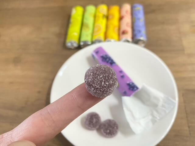 1粒の大きさは指先に乗るくらいの小ぶりサイズ。周りには白いオブラートのようなものがまぶされていて、一口目の食感はザラザラとしています。