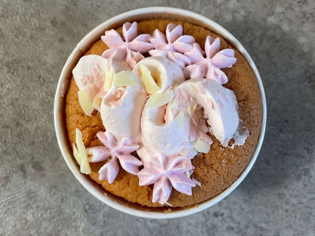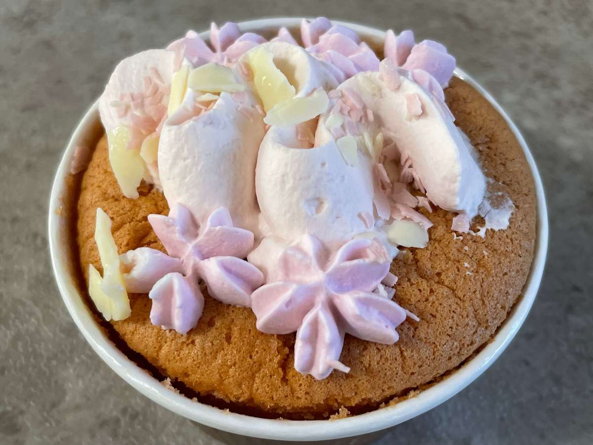 ふわっと膨らんだケーキ部分に、たっぷりクリームがデコレーションされています。