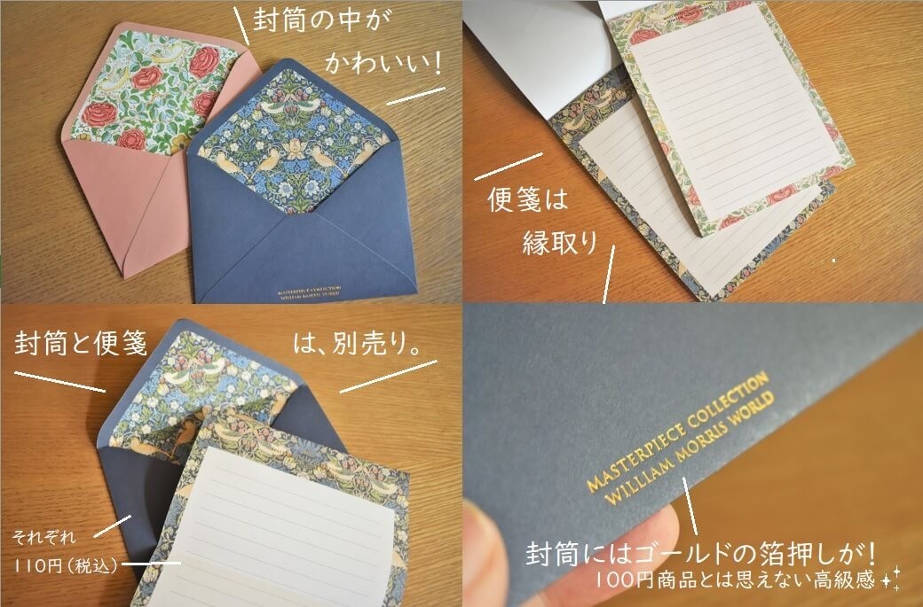 封筒と便箋は別売り。封筒は8枚入りで110円(税込/2022年3月現在)、便箋は20枚つづりで110円(税込/2022年3月現在)。このクオリティーでこの価格はちょっと驚きですよね!