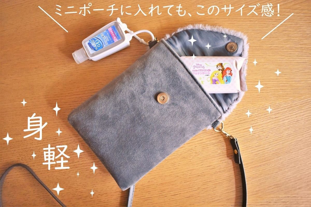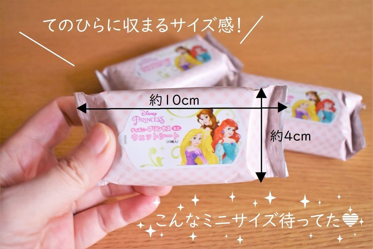 実際に、スリコで購入したスマホとカードが入るくらいのミニポーチに入れてみると、こんなサイズなんですよ!「荷物はあまり持ちたくないけど、ウェットシートは持ち歩きたい」人にはぴったり。しかもちょこんとディズニープリンセスが出てくるのが乙女心をくすぐります!