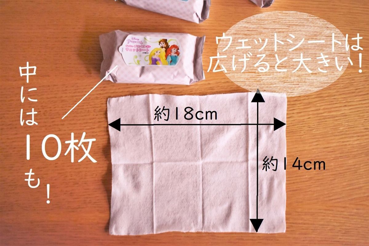 そしてこのミニサイズのパッケージの中に、このサイズのウェットシートが10枚も入っています。これだけ枚数があればハンカチやティッシュの代わりに十分働いてくれそう!なんとも頼もしいミニサイズウェットシートです。