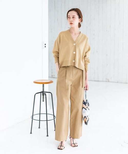 肌なじみのいいベージュのワントーンでまとめると、知的で柔らかな雰囲気に。