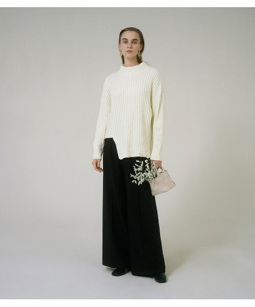 アクリルコットンのニットは裾のアシンメトリーがポイント。