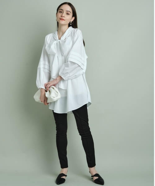 ボリュームのあるタイや袖ディテールがかわいらしいブラウス。カラースカートなどで甘×甘にかためずに、黒のスキニーで程よく甘さを残しつつ引き締めます。