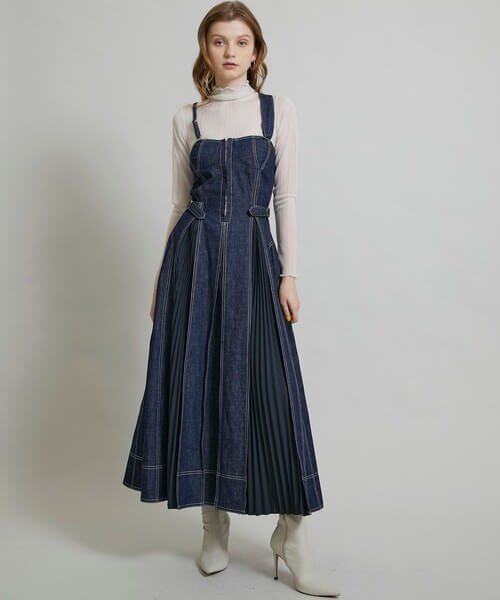 たっぷりボリュームのプリーツ切り替えがかわいいデニムワンピースは、ラブリーにふらずにモードな雰囲気を漂わせて。ベージュやグレーなどのニュアンスのあるカラーで春っぽくまとめるのがおすすめ。