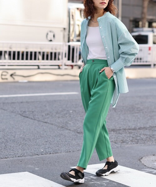 トレンドカラー「グリーン」のテーパードパンツ。スウェットにもTシャツにもなんにでもマッチしますが、同系色のシャツを組み合わせるとおしゃれが格上げされます。