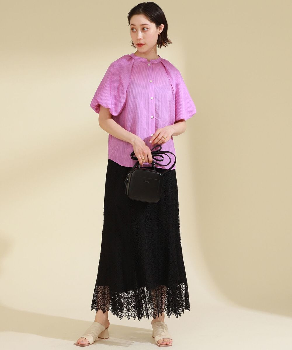 ボタニカル染めの春らしいレースブラウスは、同生地のミモレ丈スカートで上品にまとめます。