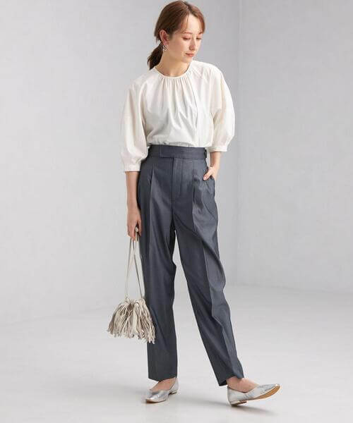 1枚で着映えする女性らしいブラウスは、オンにもオフにも大活躍します。センタープレス入りのテーパードパンツとの組み合わせは、ジャケットを羽織れば即オフィスコーデに。