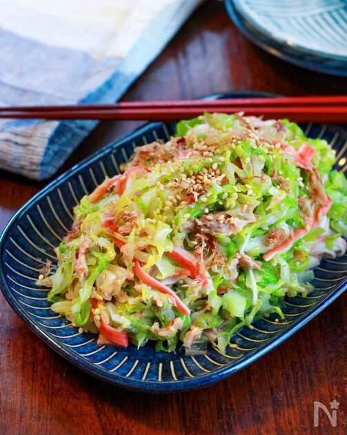 春キャベツの甘さを思い切り味わい尽くせる旨塩味の作り置きサラダ。レンチンして甘みを引き出すのがコツ。カニカマやツナも入れて旨みとコクたっぷりに仕上げます。冷蔵で2~3日ほど保存可能。