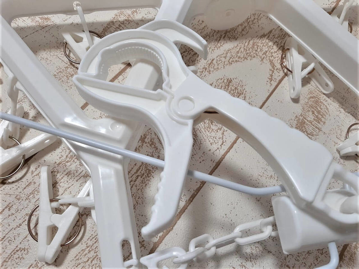 白一色のシンプルな角ハンガー。ピンチが44個ついているのでたくさん小物を干せます♪