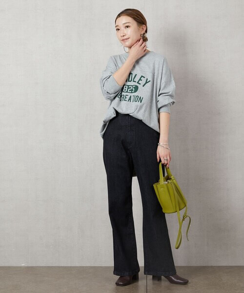 デニムアイテムがトレンドの今シーズン。デニムパンツも美脚見えのフレアシルエットをチョイスして!