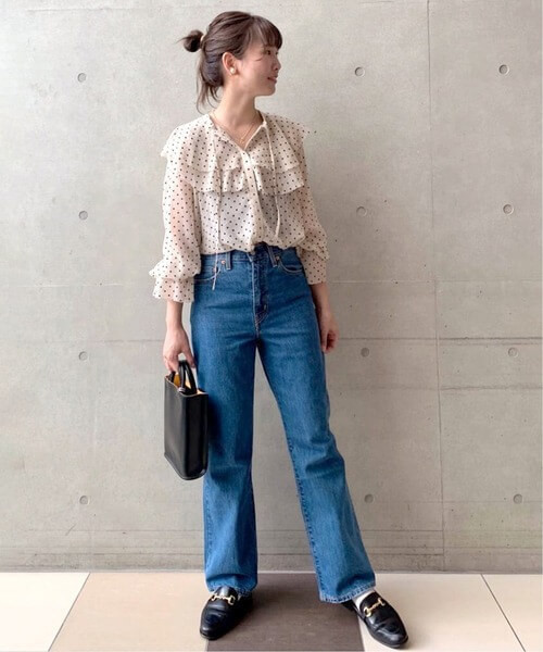 しっかりとした硬さのあるデニムには、あえて柔らか素材のトップスで女性らしさを演出します。