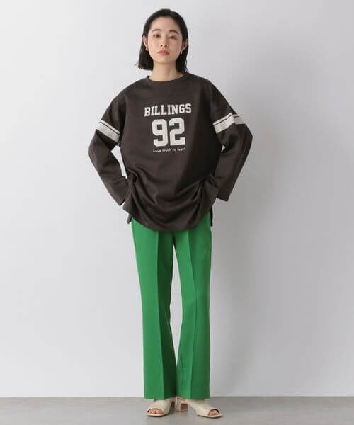 きれいめパンツは、ナンバリングのプリントが目を引くフットボールTで、カジュアルにシフト。