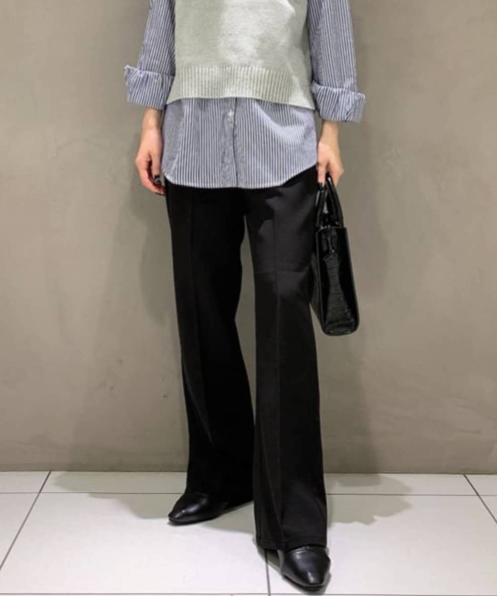 パンツ選びのポイントは、セミフレアシルエットでハイウエスト、センタープレス入り。今シーズンらしさを詰め込んだパンツです。