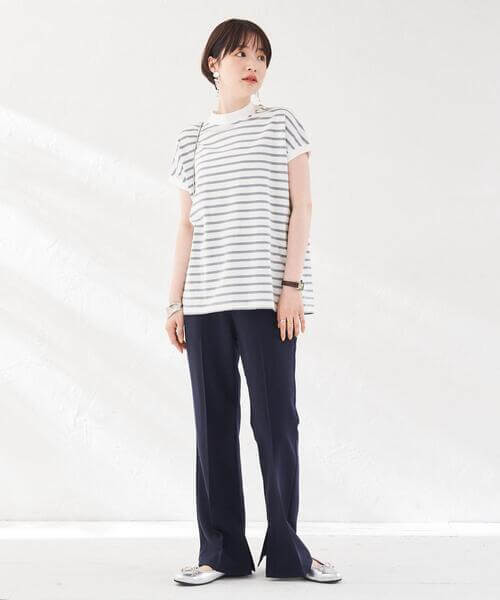 春夏注目のボーダートップスに黒のセンタープレス入りのフレアパンツを合わせて、きれいめマニッシュに着こなしています。