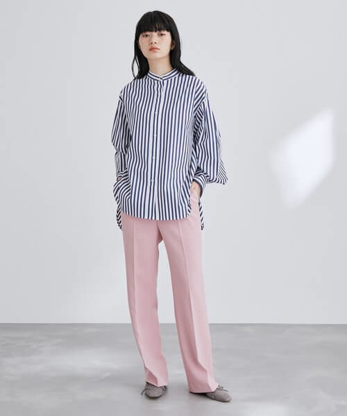 太さのあるストライプシャツはモード感を強調。シャツをインするだけでONモードに切り替えできます。