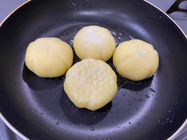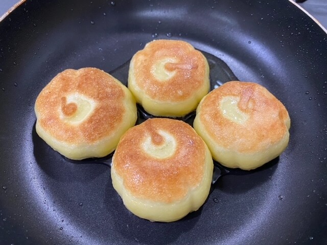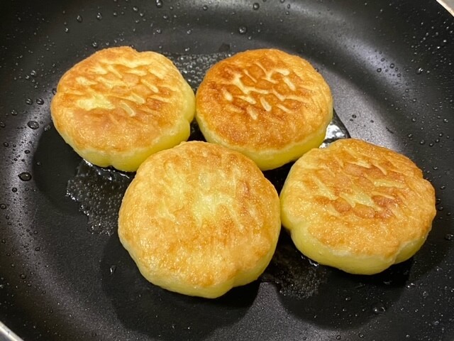 ずっと同じ面を焼き続けても焦げてしまうので、フライパンをゆすったりひっくり返したりすると、上手にキツネ色に焼き上がります。