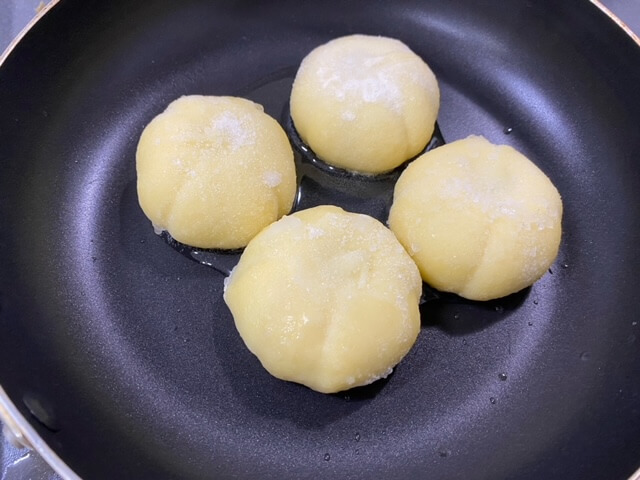 軽く油を温めたら、ホットクを冷凍されたまま入れます。