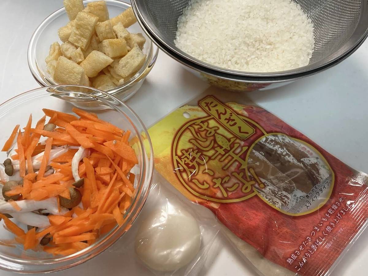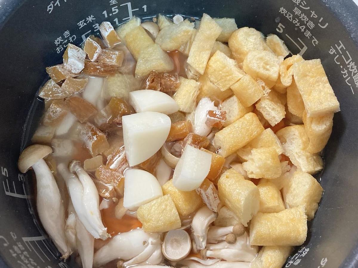 ④炊飯器に食べやすい大きさに切った人参30g、油揚げ1/2枚、しめじ20g、切った干し芋を入れる