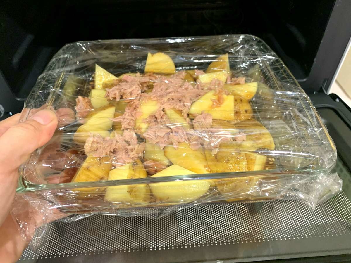 タレつなじゃがの作り方③ラップをして、電子レンジで加熱する