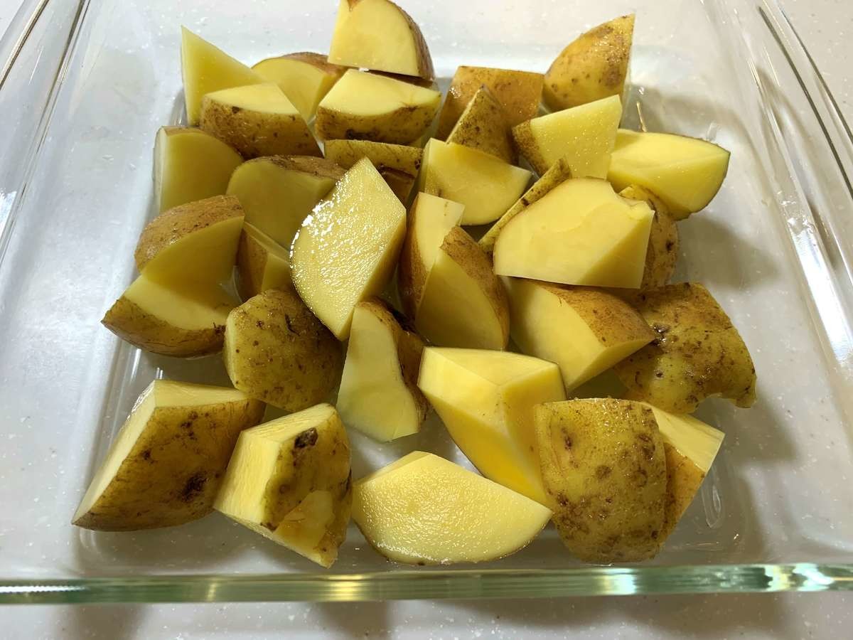 乱切りにしたじゃがいもを耐熱容器に並べます。