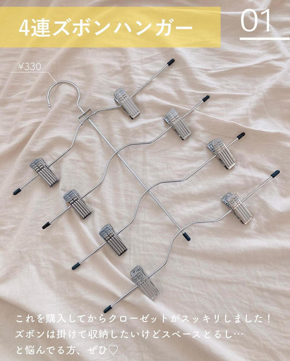 そんな問題を解決してくれるのが@piyopiyo_life_222さんが紹介している、「4連スカートハンガー(330円税込)」。