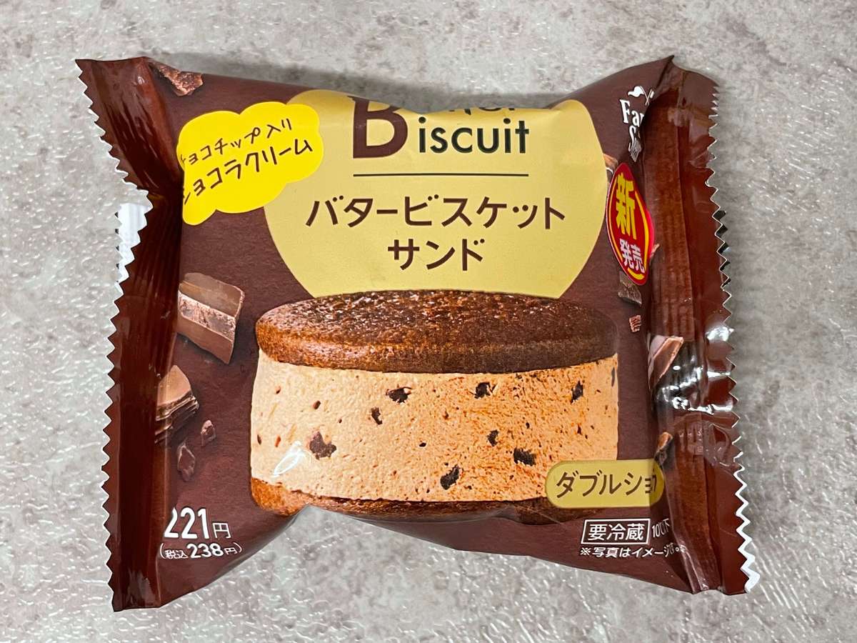 ファミリーマートより2021年6月に発売され、シリーズ累計販売数2,000万食を突破した「バタービスケットサンド」から新作「ダブルショコラ」が発売されました。