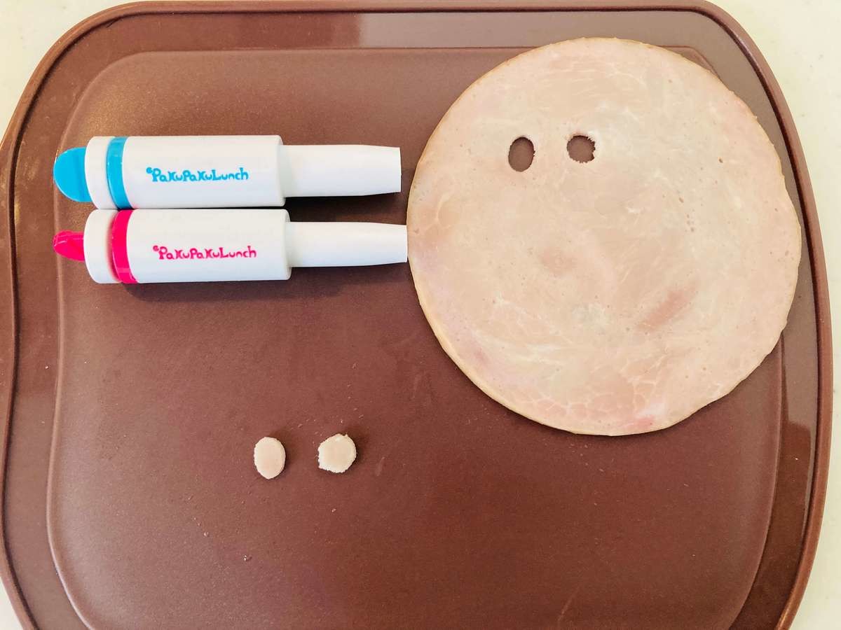 和ピックスでおかずを刺して、ハムとチーズを切り抜いてごはんにのせてみました。セリアのお弁当手作りグッズを使うだけで、ちょっぴり可愛いお弁当が完成!