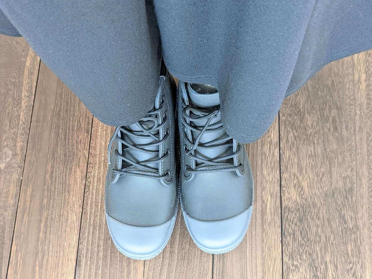 きれいめな服装に合わせて、カジュアルダウンしても◎。 防水サファリシューズの中で、男女兼用のブラックは単色なので取り入れやすいです。