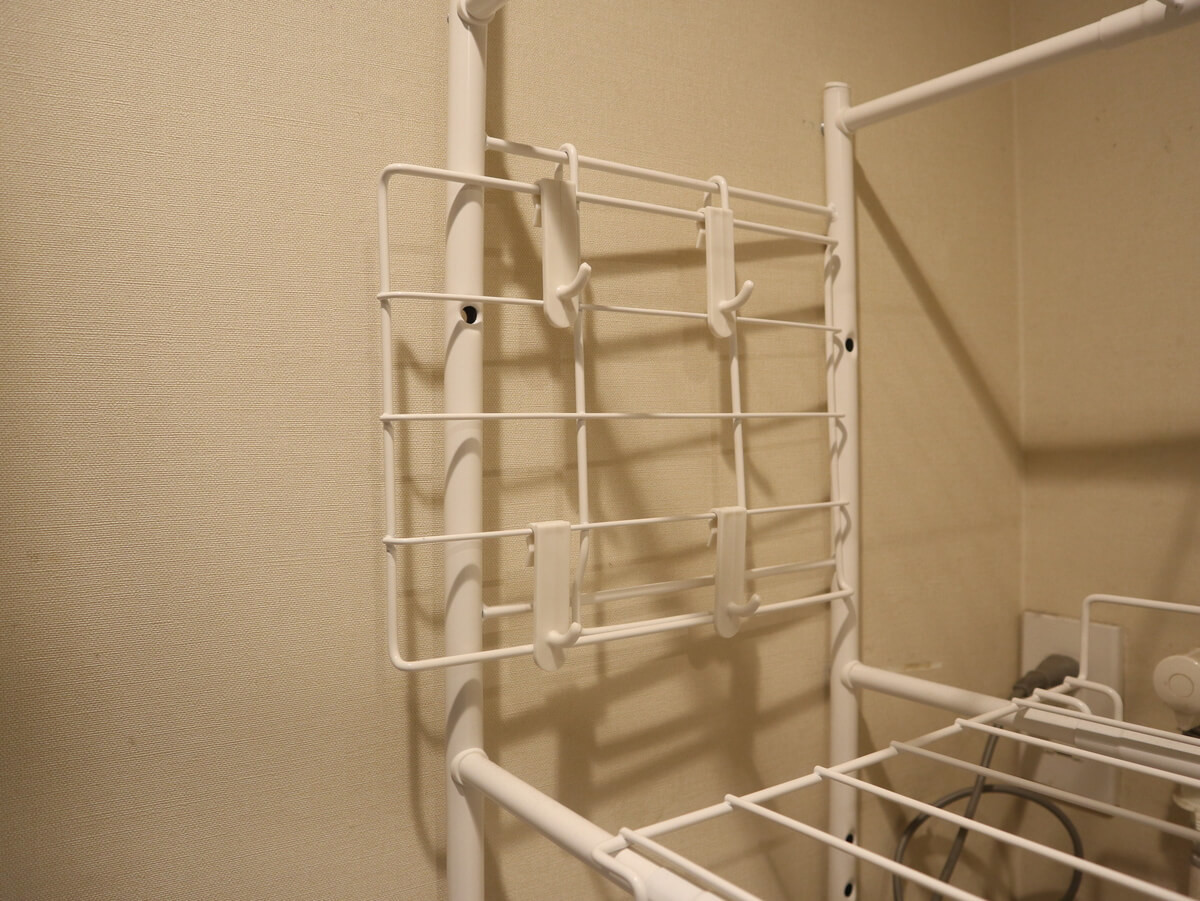 左右のポールには、バッグやベルトなども掛けられます。さらに上下には、荷物や帽子なども置ける棚がついているので自由にアレンジも。