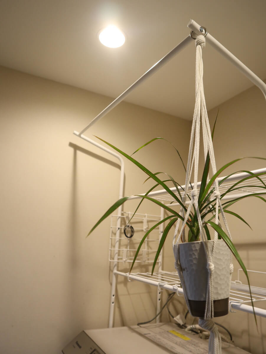 観葉植物を飾ってみましたが、ここにハンガーにかけた衣類の一時干しや、濡れタオル・バスマットなどの乾燥にもぴったり。
