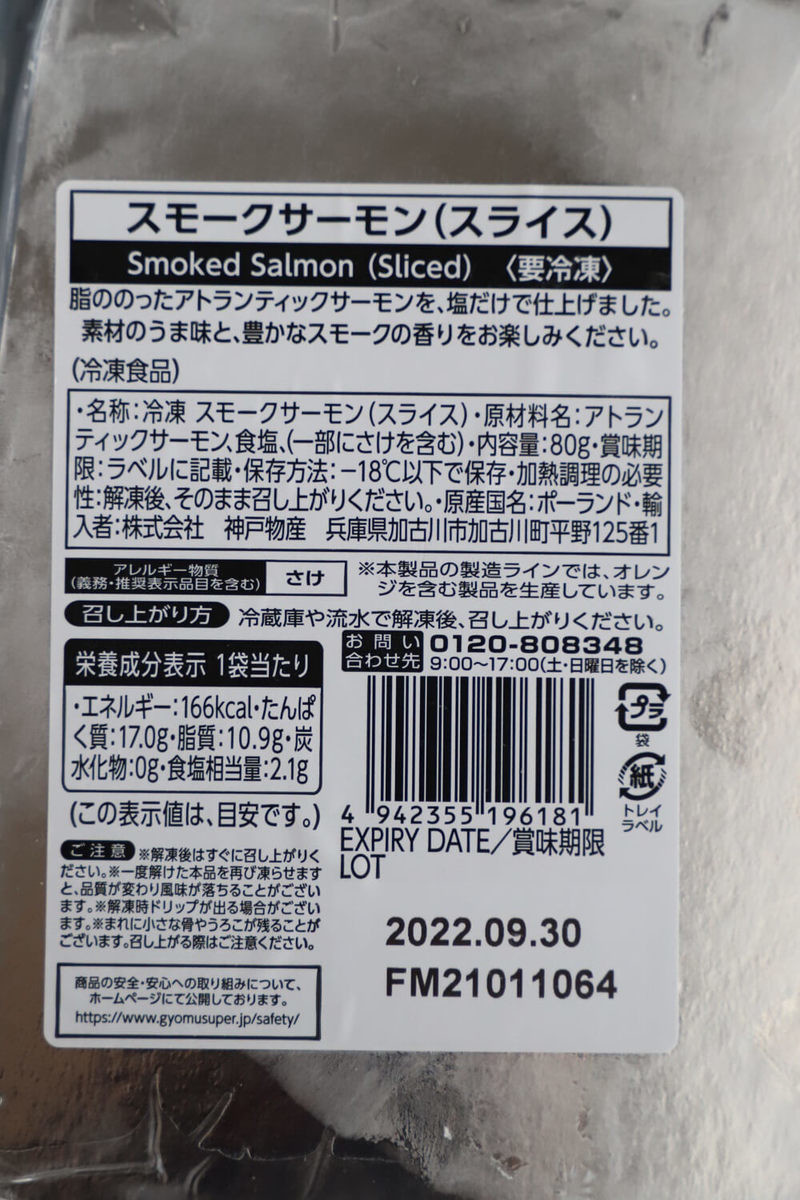 アトランティックサーモンから作られた、業務スーパーのスモークサーモンは脂がのっていて、間違いない美味しさ!