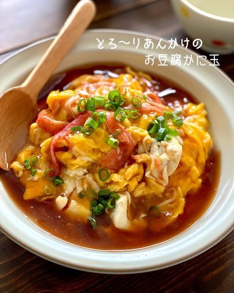 きのこたっぷりのふわふわ半熟卵に甘酢あんをとろりとかけた卵料理。ふわとろ食感でおいしく、おなかすっきり効果が高いのも魅力です。ご飯にかけて丼風にするのもおすすめ。刻みねぎを振ってどうぞ。
