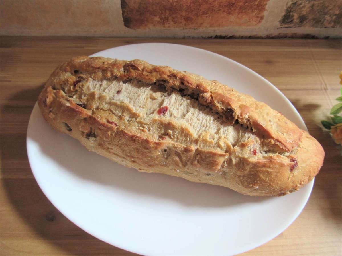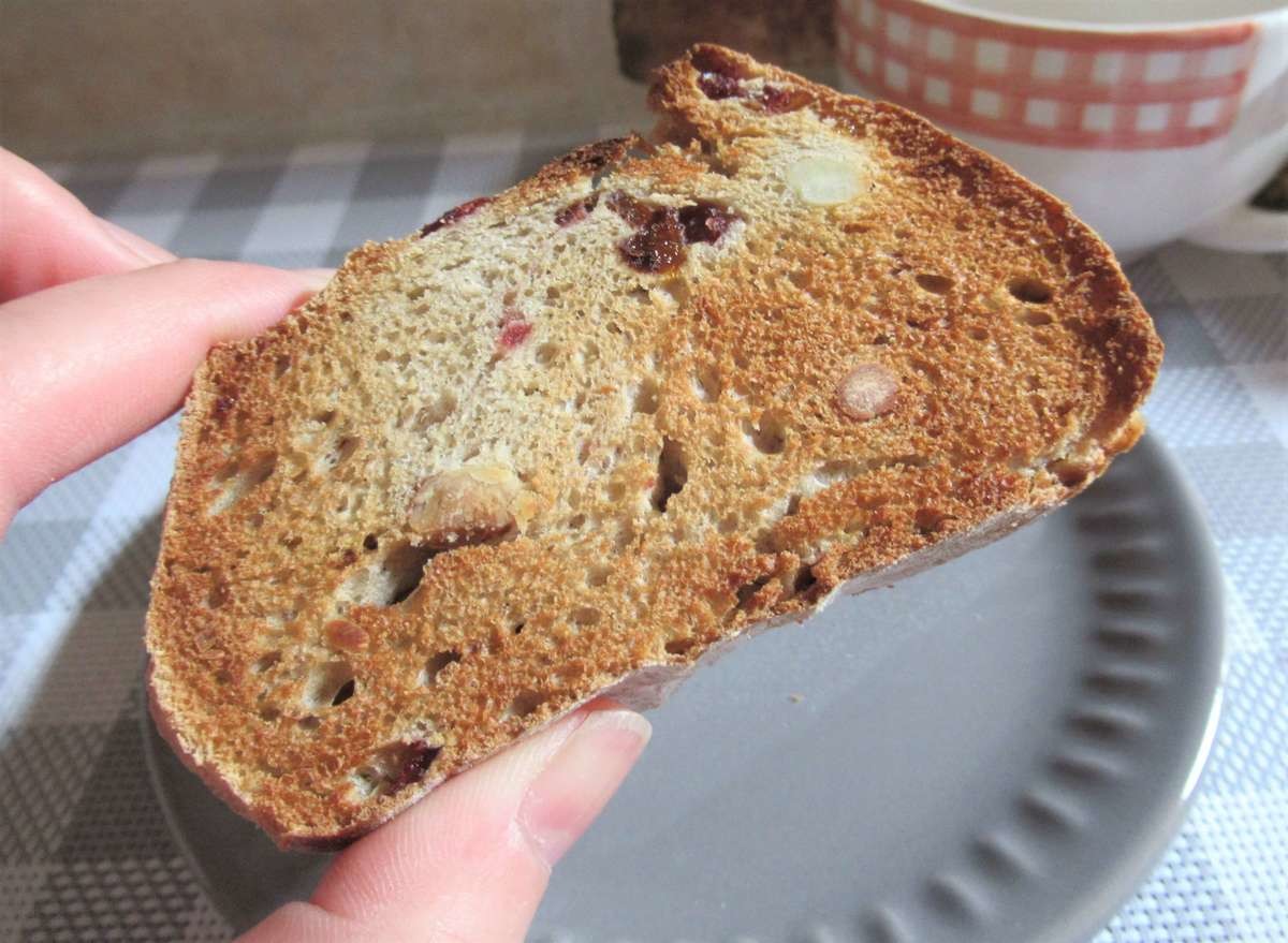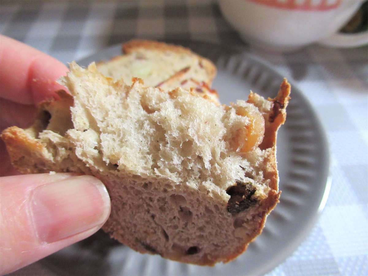 アーモンド・ヘーゼルナッツ・ドライアプリコット・クランベリーを生地に練りこんだ酵母パンなんだとか。
