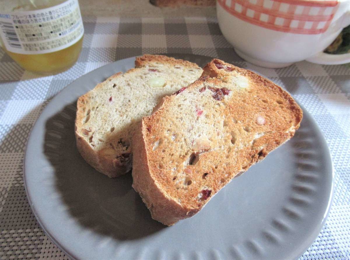 まずは、そのまま食べてみるとナッツやクランベリーの味がいいアクセントになって、何もつけなくても十分おいしい……!