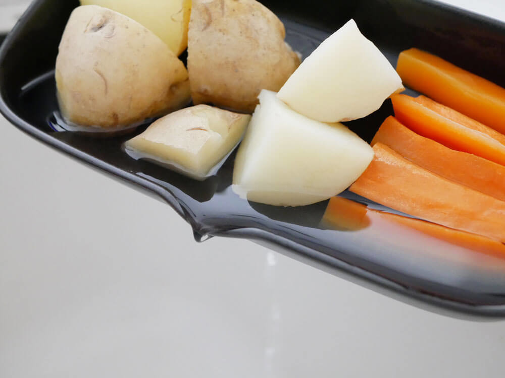 例えば、根菜類などの火の通りにくい食材などを「【TOJIKI TONYA】グリルプレート」を使って電子レンジで加熱しておくことによって下ごしらえが簡単に終了し、調理の時短にも。