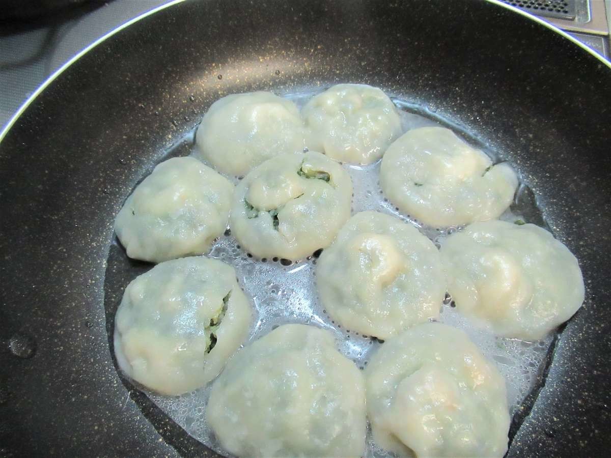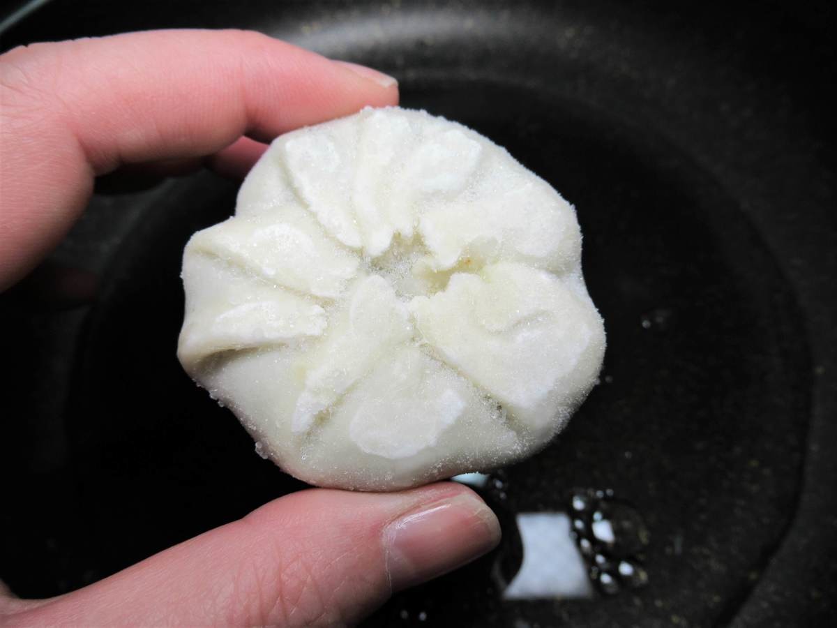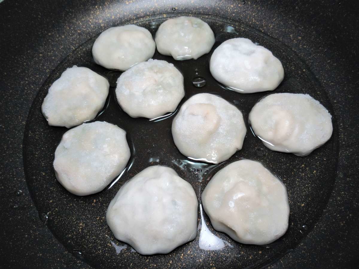 水150mlと大さじ1の油を入れたフライパンに、凍ったままの海老にら饅頭を並べます。 ここでは、まだ火はつけません。