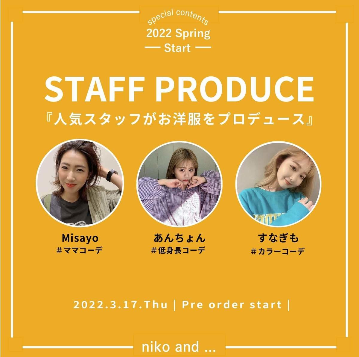 今回のプロジェクトでは、niko and ... の人気スタッフである Misayo(イオンモール宮崎店)、あんちょん(イオンモール草津店)、すなぎも(金沢フォーラス店)の3名が登場し、親子リンクで着られるアイテムや低身長でも着こなせるアイテム、カラーリングが新鮮なアイテムなど、自身の強みを生かしたアイテムを提案します。