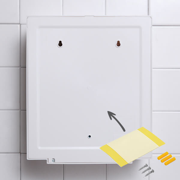 取り付けには付属の木ネジか両面テープを使用します。アンカープラグが付いているので、コンクリート壁にも設置可能です。 しっかり取り付けしたいときは壁に付けた木ネジに本体を引っ掛けて、 壁に穴を空けたくない場合は両面テープで手軽にと使い分けられます。