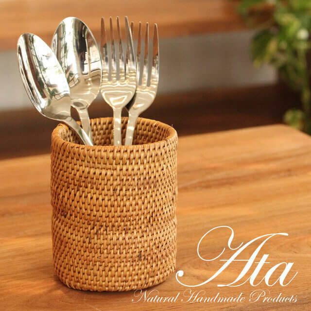 こちらの作品のサイズは、直径約8cm×約10cmです。栽培が難しく希少価値の高いアタ性の素材を丁寧に編んだ作品です。カトラリースタンドですが、ペン立てやお化粧のブラシ入れなどにもできるので、とっても汎用性の高いアイテムですよ!