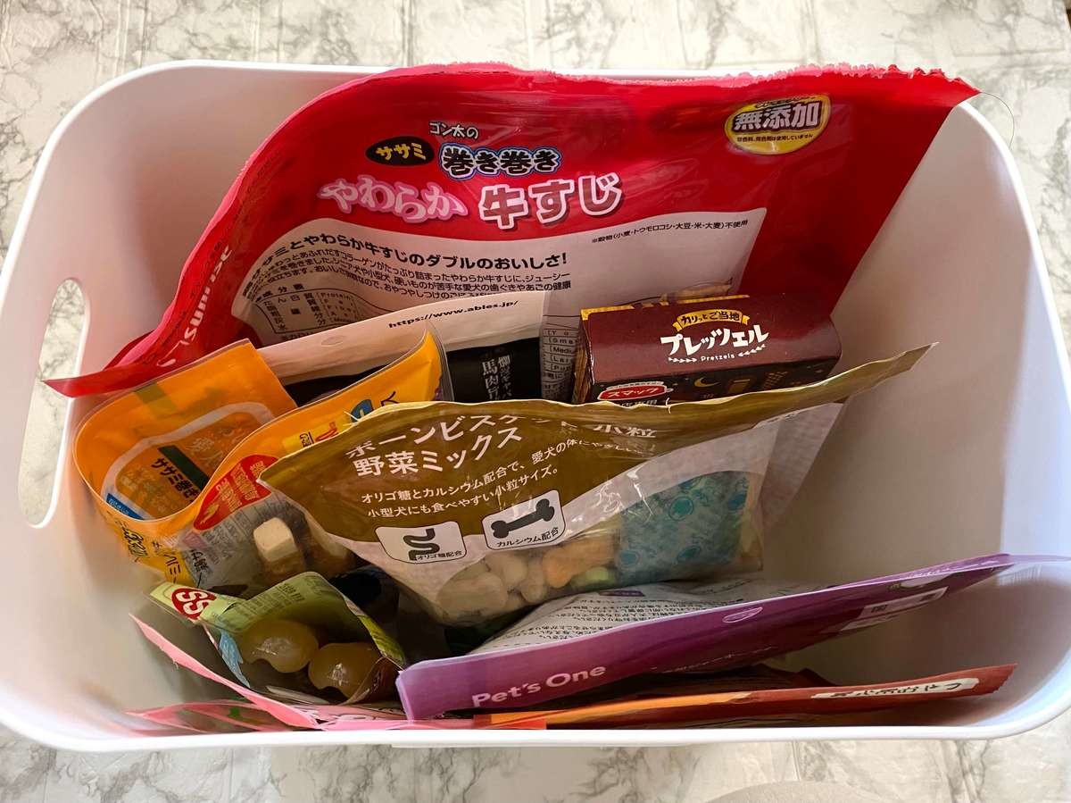 筆者は、使用頻度が高い犬のおやつを入れています。高さがあるため、おやつを立てて保管すれば、サッと取り出せますよ!