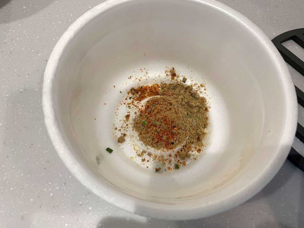どん兵衛のカップに粉末スープの素と七味唐辛子を入れます。