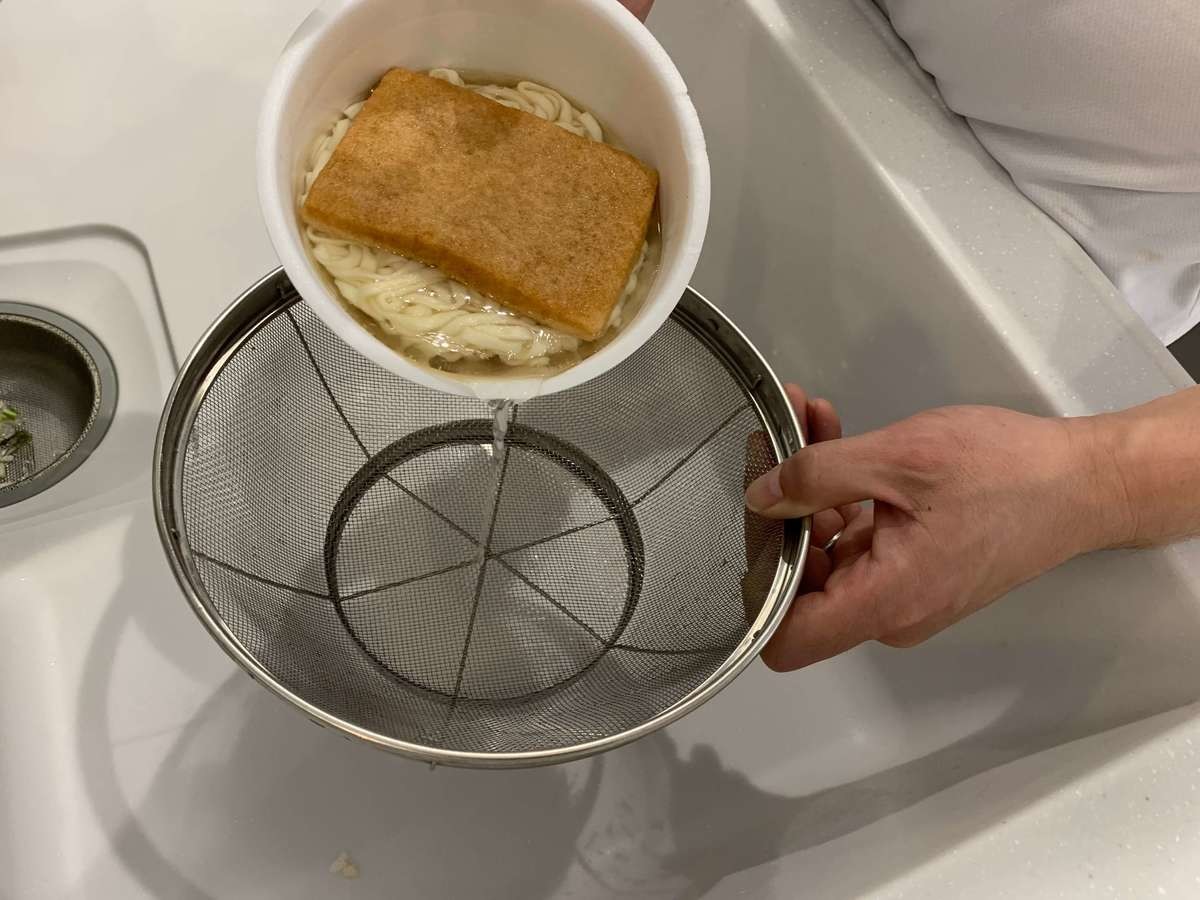 本来は熱湯を入れて5分待ちますが、今回は「4分」経ったらザルでお湯を湯切りします!どん兵衛を湯切るなんて前代未聞ですね。